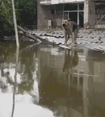 This unfortunate dog was frightened and alone, floating on a metal “island” of debris after the catastrophic flooding in Ukraine in June. But there’s a happy ending!