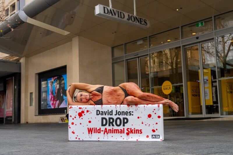 Animal rights activist Tash Peterson joined PETA outside the David Jones department store in Perth today to protest its sales of products made from skin stripped from wild animals such as snakes, lizards, crocodiles, and ostriches. Wearing a “bloodied” snake-print bikini to resemble an abused reptile, Tash laid on a “blood-soaked” chopping block that reads “David Jones: Drop Wild-Animal Skins”.